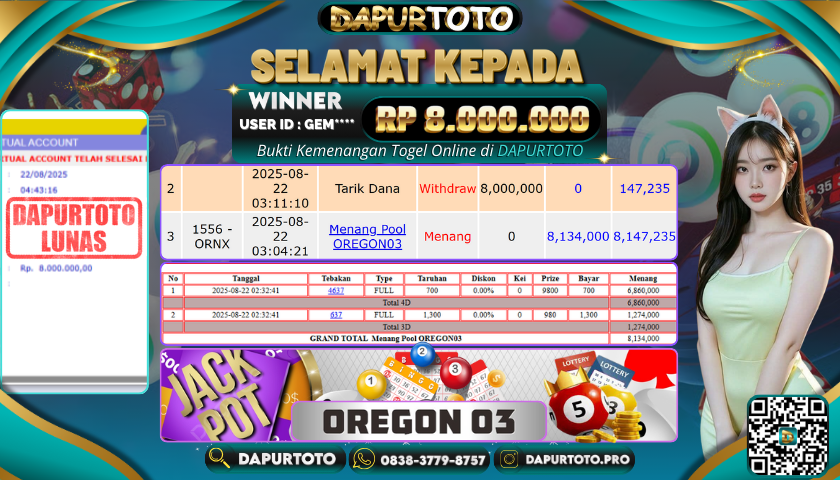 BUKTI JACKPOT TOGEL ONLINE 22 Agustus 2025 Posted by team logic OREGON 03 JUM’AT, 22 AGUSTUS 2025 RP. 8.000.000,- SELAMAT KEPADA PEMENANG, SALAM JP ! Updated: 22 Agustus 2025 at 7:14 am ◀ BUKTI JACKPOT SLOT GAME BUKTI JACKPOT SLOT GAME ▶