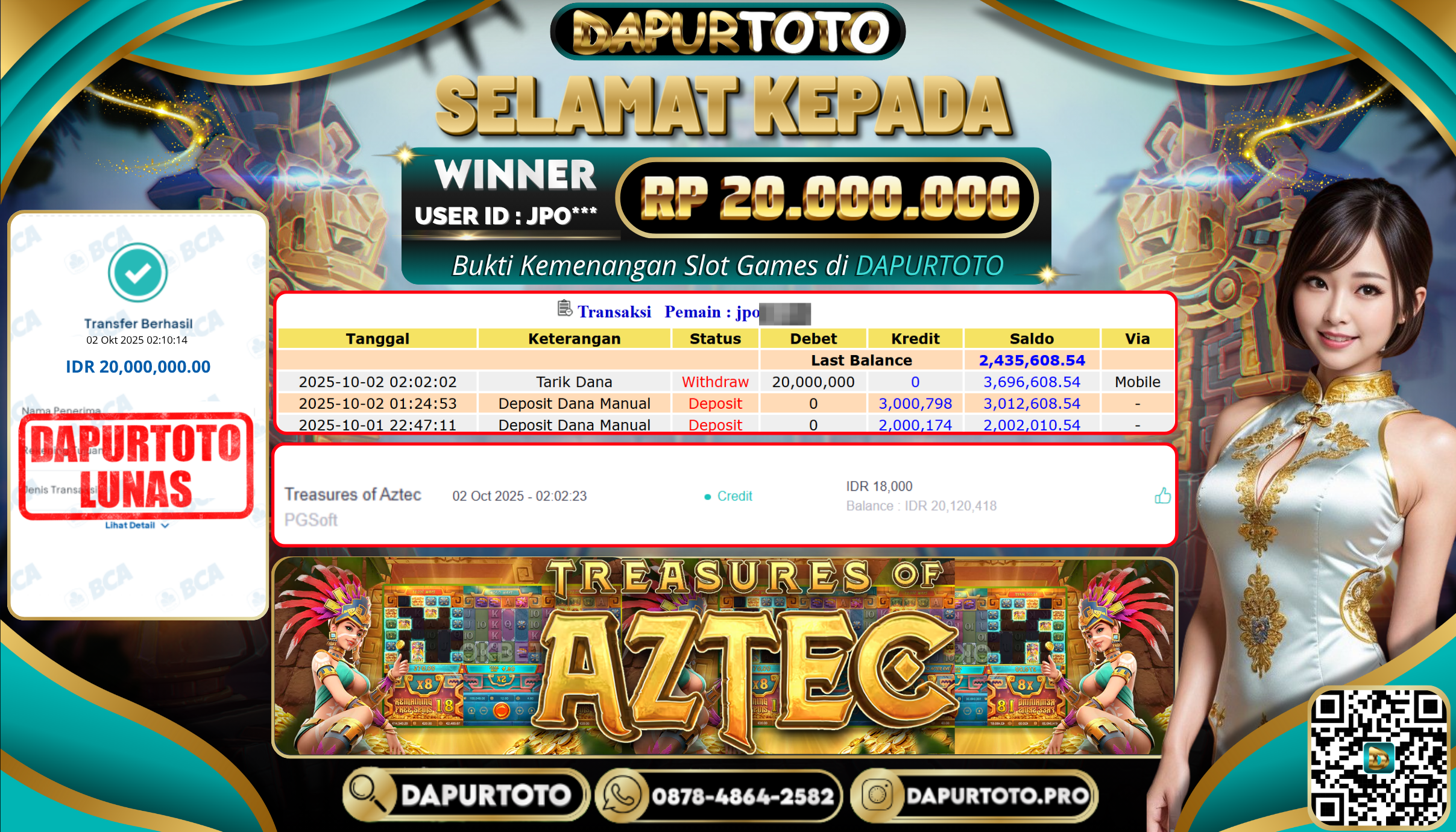 BUKTI JACKPOT SLOT GAME 2 Oktober 2025 Posted by team logic TREASURES OF AZTEC KAMIS,02 OKTOBER 2025 RP. 20.000.000,- SELAMAT KEPADA PEMENANG, SALAM JP ! Updated: 2 Oktober 2025 at 6:36 am ◀ BUKTI JACKPOT SLOT GAME BUKTI JACKPOT SLOT GAME ▶