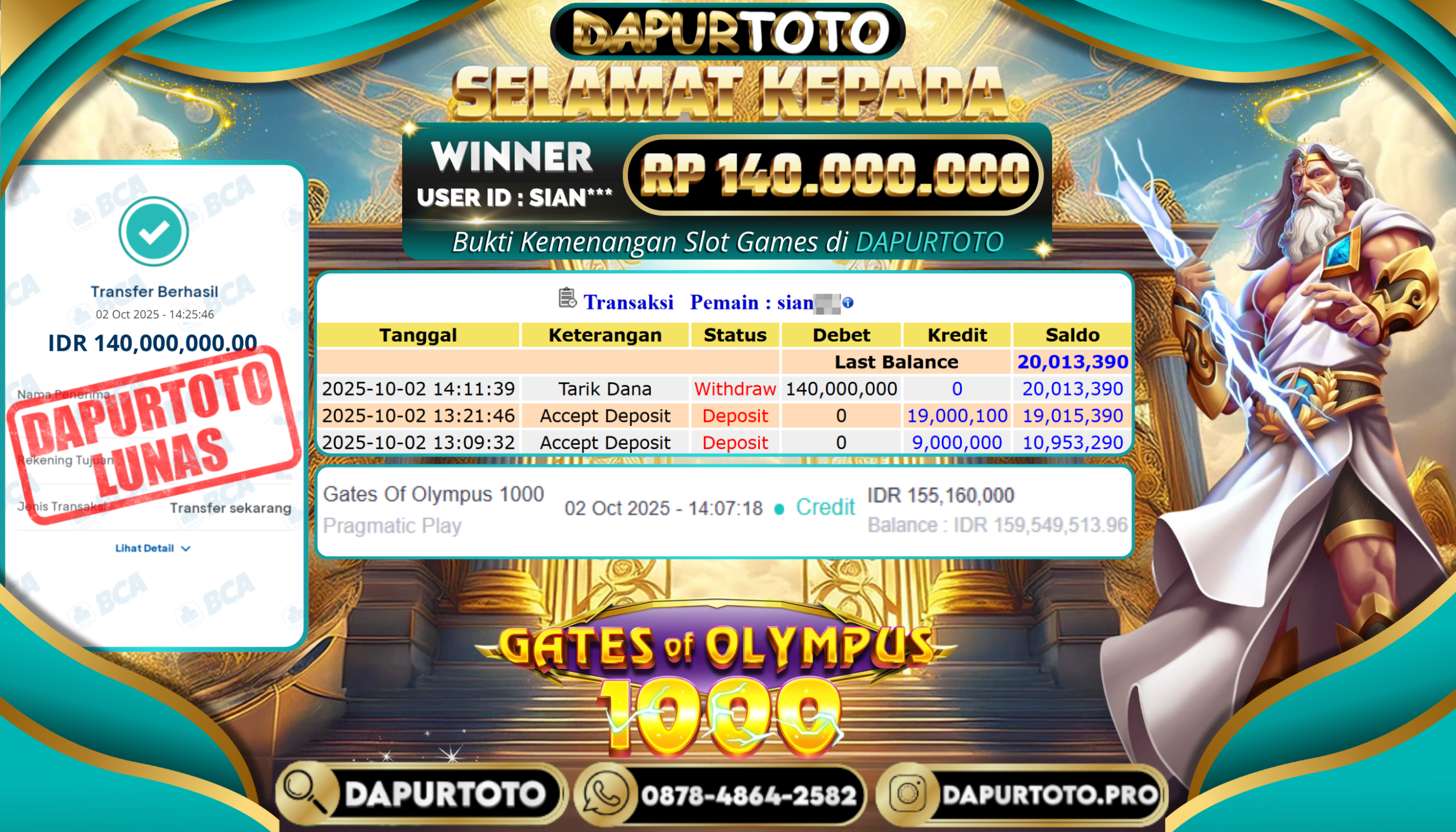 BUKTI JACKPOT SLOT GAME 2 Oktober 2025 Posted by team logic GATES OF OLYMPUS 1000 KAMIS,02 OKTOBER 2025 RP. 140.000.000,- SELAMAT KEPADA PEMENANG, SALAM JP ! Updated: 2 Oktober 2025 at 3:33 pm ◀ BUKTI JACKPOT SLOT GAME BUKTI JACKPOT SLOT GAME ▶