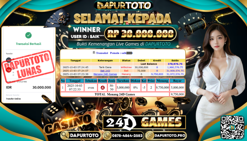 BUKTI JACKPOT LIVE GAMES 3 Oktober 2025 Posted by team logic 24 D GAMES JUM’AT ,03 OKTOBER 2025 RP. 30.000.000,- SELAMAT KEPADA PEMENANG, SALAM JP ! Updated: 3 Oktober 2025 at 2:01 pm ◀ BUKTI JACKPOT SLOT GAME BUKTI JACKPOT SLOT GAME ▶