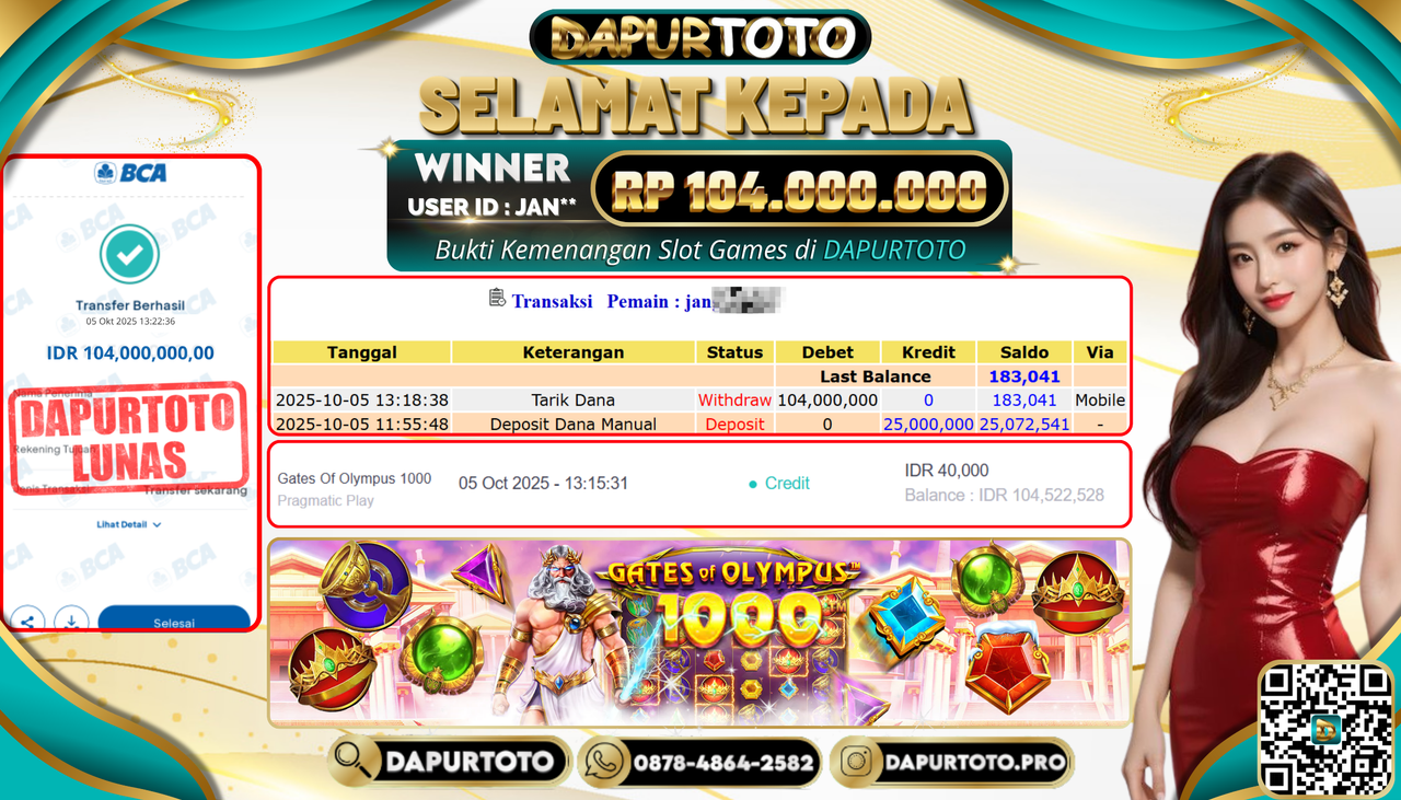 BUKTI JACKPOT SLOT GAME 5 Oktober 2025 Posted by team logic GATES OF OLYMPUS 1000 MINGGU ,05 OKTOBER 2025 RP. 104.000.000,- SELAMAT KEPADA PEMENANG, SALAM JP ! Updated: 5 Oktober 2025 at 1:37 pm ◀ BUKTI JACKPOT SLOT GAME BUKTI JACKPOT SLOT GAME ▶